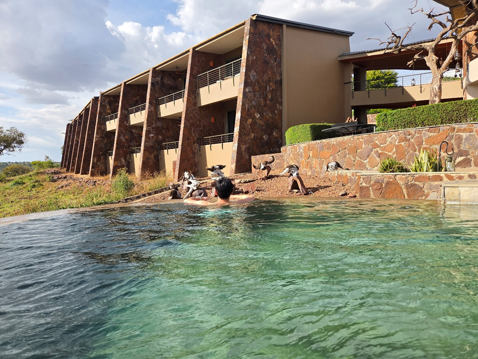 둘째 날에는 사파리 일정을 조금 일찍 마치고 숙소로 돌아와 수영장에 가봤어요. 수영장은 길게 뻗어 있고, 멀리 세렝게티 초원이 그대로 이어지면서 마치 자연과 수영장이 한 화면에 들어오는 듯한 느낌이에요. 물은 꽤 차가운 편이라 오래 들어가기는 조금 힘들었고, 그래서인지 실제로 물에 들어간 사람보다는 선베드에 앉아 경치를 감상하는 사람들이 더 많았어요.