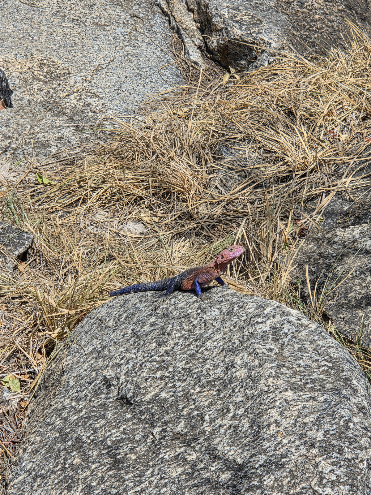 밥을 다 먹고 시간이 조금 남아서 주변을 산책했어요. 너무 멀리까지는 못 가고, 그래도 주변을 천천히 돌면서 사진도 찍고, 공기도 마시고, “우리가 아프리카 한가운데 있구나”를 실감하는 시간을 가졌죠. 그런데 거기서 정말 신기한 도마뱀을 봤어요. 몸 반은 파랗고, 반은 빨간 색을 띄고 있는 도마뱀이었는데, 나중에 찾아보니 세렝게티에서 종종 볼 수 있는 아가마 도마뱀 계열이더라고요.
