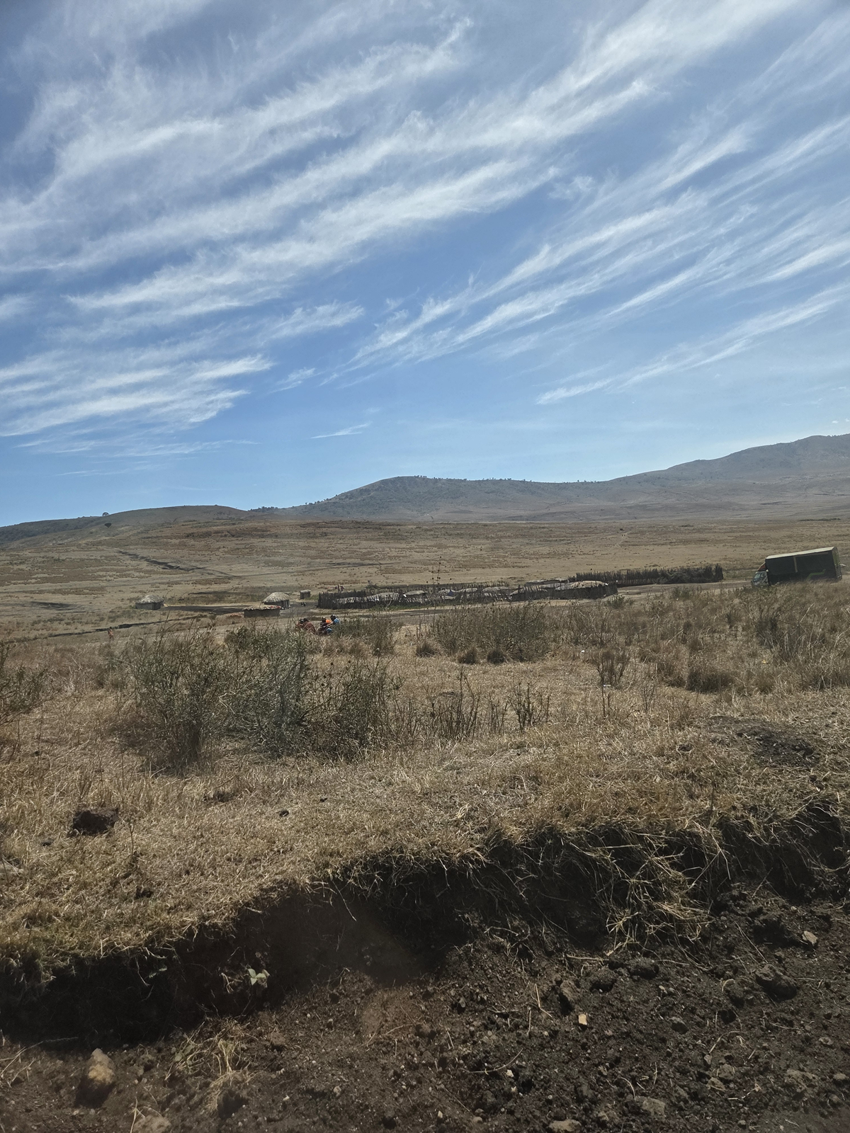 응고롱고로로 올라가는 길에 마사이족의 집과 사람들도 실제로 볼 수 있었어요. 초원 한가운데 동그랗게 둘러진 울타리, 전통 가옥, 그 사이를 오가는 소 떼… 교과서나 다큐멘터리에서 보던 장면이 눈앞에서 펼쳐지는 느낌이었어요. 마사이족은 전통적으로 목축업을 하면서 살아가는 부족인데, 남자들이 긴 막대기를 들고 가축들을 몰고 다니는 모습이 정말 인상적이었어요.