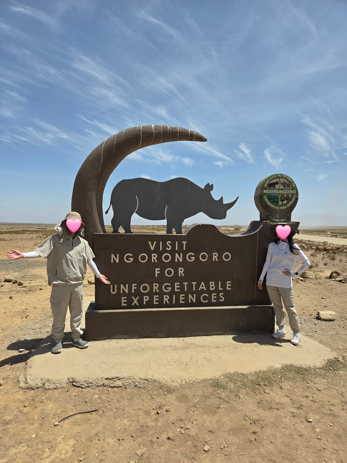 점심을 마치고 다시 길을 나서 응고롱고로 보호구역 입구로 향했어요. 응고롱고로는 세계에서 가장 큰, 활동을 멈춘 화산 분화구가 있는 보호구역이고, 현재는 야생동물 보호, 마사이족의 전통적인 방목, 관광이 함께 공존하는 곳이에요. 입구 쪽에 도착해서 저희도 인증샷을 남겼어요.