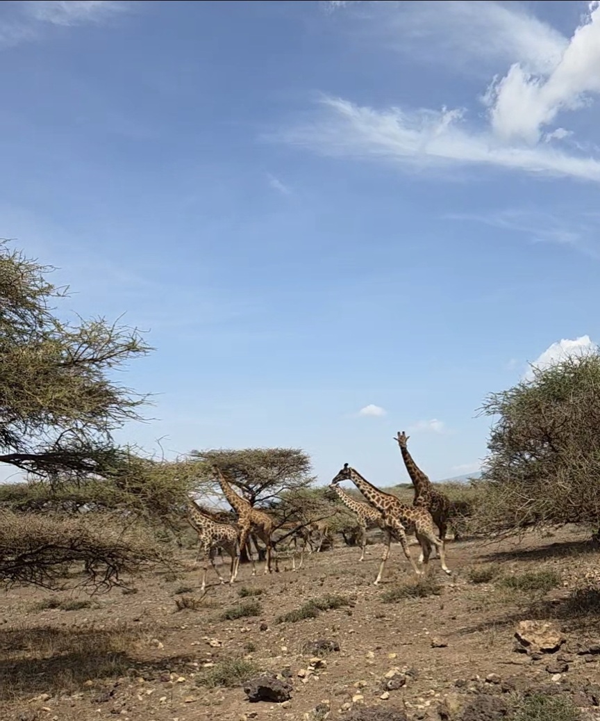 그래도 이 길이 지루하진 않았어요. 세렝게티와 응고롱고로 모두 보호구역이기 때문에 이동하는 길 자체가 하나의 사파리거든요. 창밖만 봐도 누군가 계속 지나가요, 얼룩말, 누, 톰슨가젤… 그러다 정말 압도적인 순간이 있었는데, 응고롱고로 쪽으로 가는 길에 엄청 큰 기린 떼를 만난 거예요. 차 바로 옆을 여유롭게 걸어가는데, 길게 뻗은 다리, 우아하게 움직이는 목, 초원을 가로지르는 실루엣이 너무 멋있었어요.