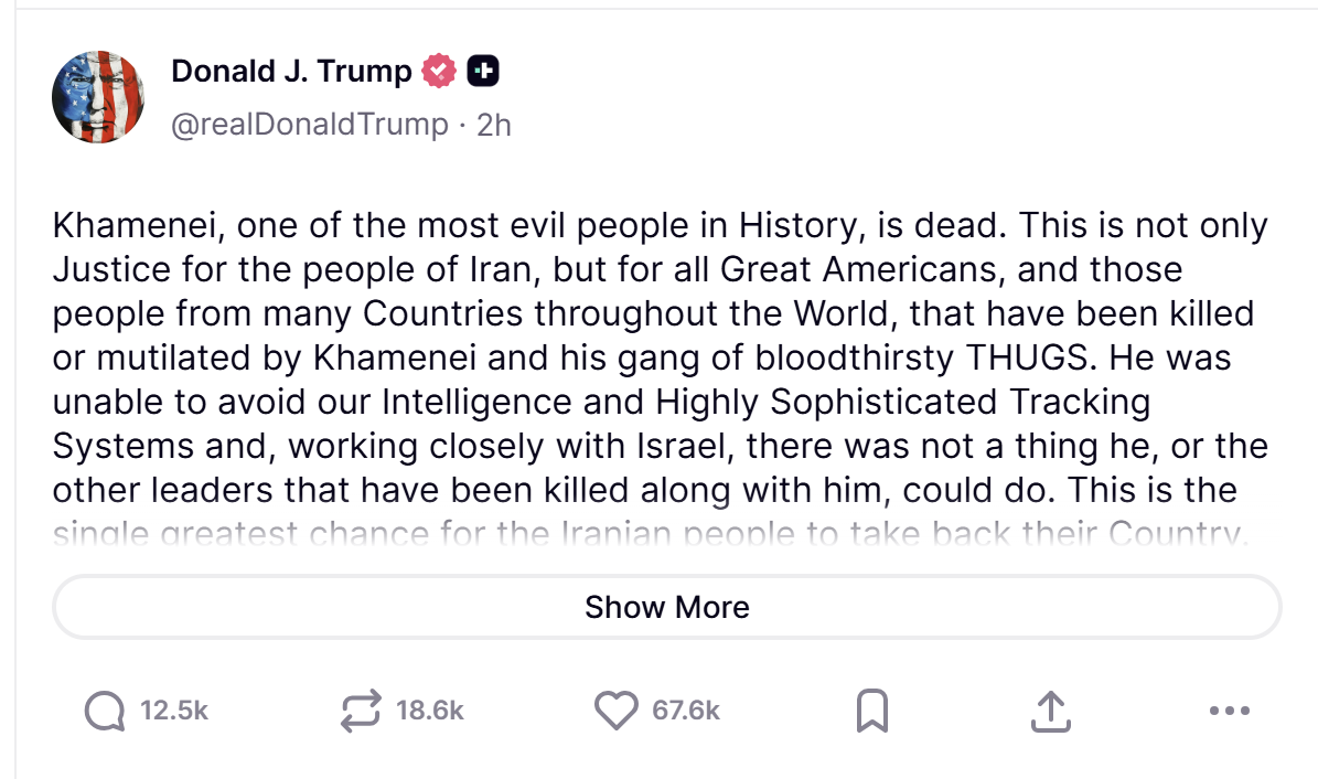 “하메네이는 죽었다, 역사상 가장 사악한 인물 중 하나였다”라고 직접 적었고,