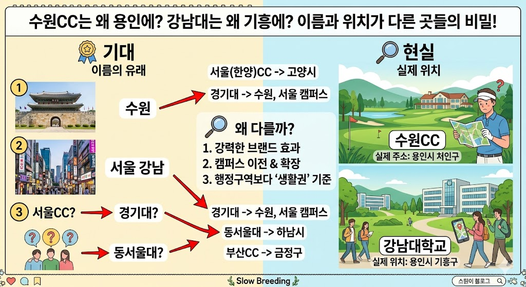 수원CC는 왜 수원에 없을까, 이름과 실제가 다른 곳들! (수원CC, 강남대학교, 동서울대학교)