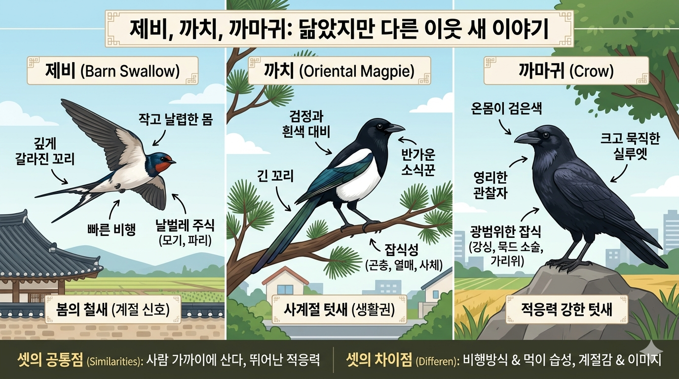 제비는 날렵한 운동선수 같고, 까치는 동네 소식통 같고, 까마귀는 조금 조용하지만 눈치 빠른 관찰자처럼 느껴집니다.
