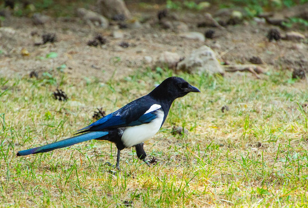 까치는 땅과 나무 주변에서 여러 먹이를 찾으며,