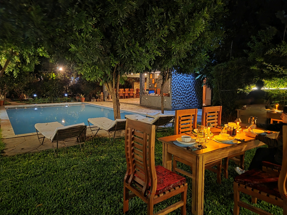 다만 수영장 물 상태가 썩 깨끗해 보이진 않아서 그냥 바라보는 걸로 만족했습니다. 조식은 다음날 아침에 먹었는데, 팬케이크와 과일, 빵, 잼 정도의 간단한 구성이었어요. 아래 사진에서 보이는 수영장 건너편 공간에서 먹었습니다.